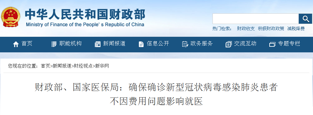 财政部、国家医保局:确保确诊新型冠状病毒感染肺炎患者不因费用问题影响就医